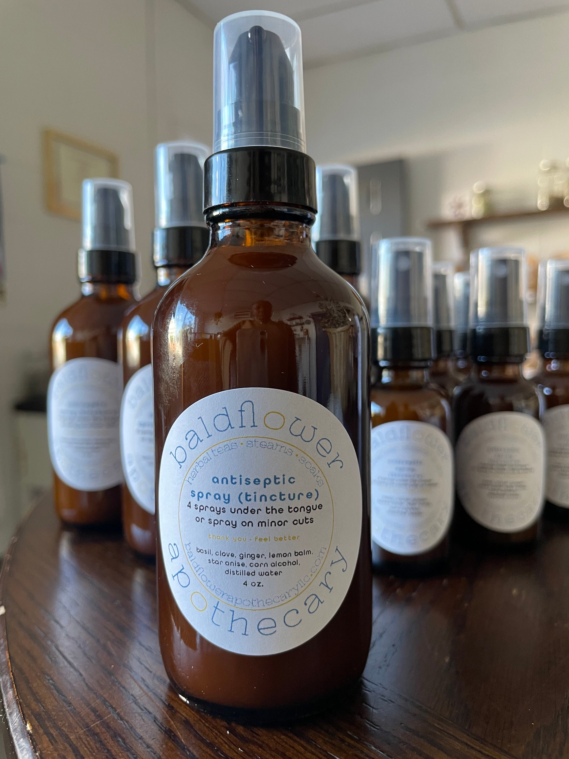 baldflower's antiseptic spray doubles as an antibacterial & antiviral spray for small cuts & sores and as a tincture you can spray under the tongue to help your body move through colds and other viral issues including boils. four (4) sprays under the tongue as needed, no more than 20 sprays per day.