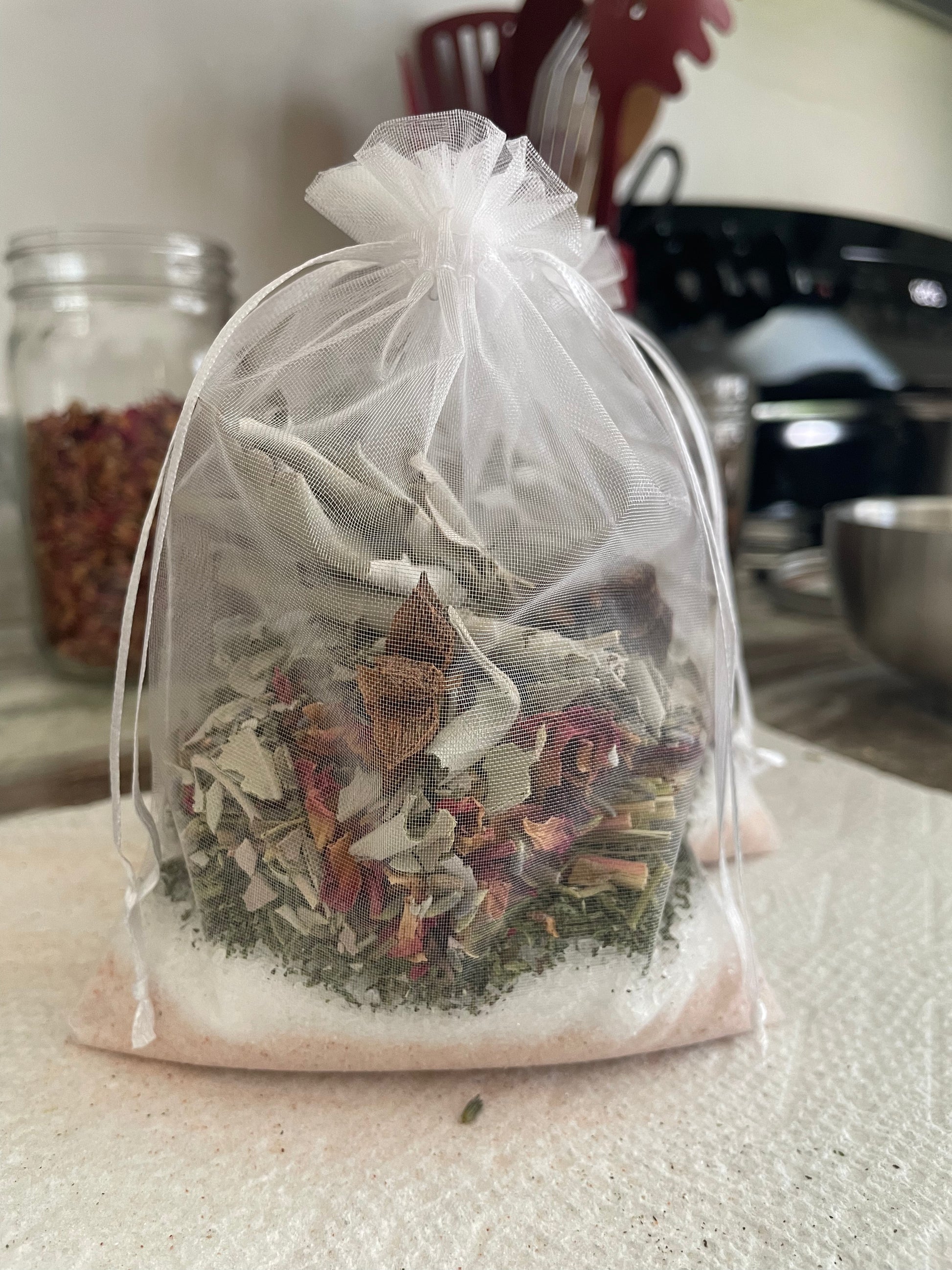 ingredients: epsom salt, himalayan pink salt, damiana, star anise, white sage, rose, lavender